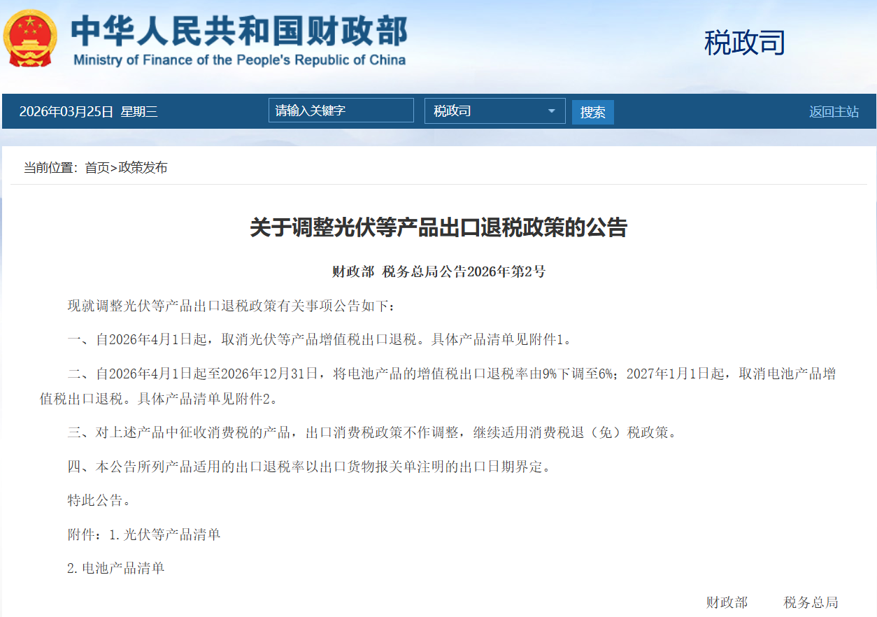 According to the latest announcement from the Ministry of Finance and the State Taxation Administration, effective April 1, 2026, my country will officially abolish VAT export tax rebates for products such as photovoltaics, while implementing a "transitional phase-out" for battery-related products.