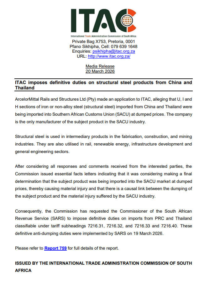 Recently, the International Trade Administration Commission of South Africa issued a new ruling imposing an anti-dumping duty of 74.98% on U-beams, I-beams, H-beams, as well as other structural steel products of various angles, shapes, and cross-sections originating from or imported from China; the anti-dumping duty rate applicable to Thailand was set at 20.32%.