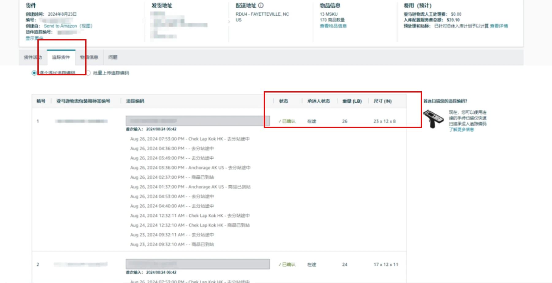 当货件的状态转变为“已发货"时,卖家可在亚马逊卖家中心的“货件一览"页面上点击"追踪货件",将自动获取该货件的详细物流轨迹信息。