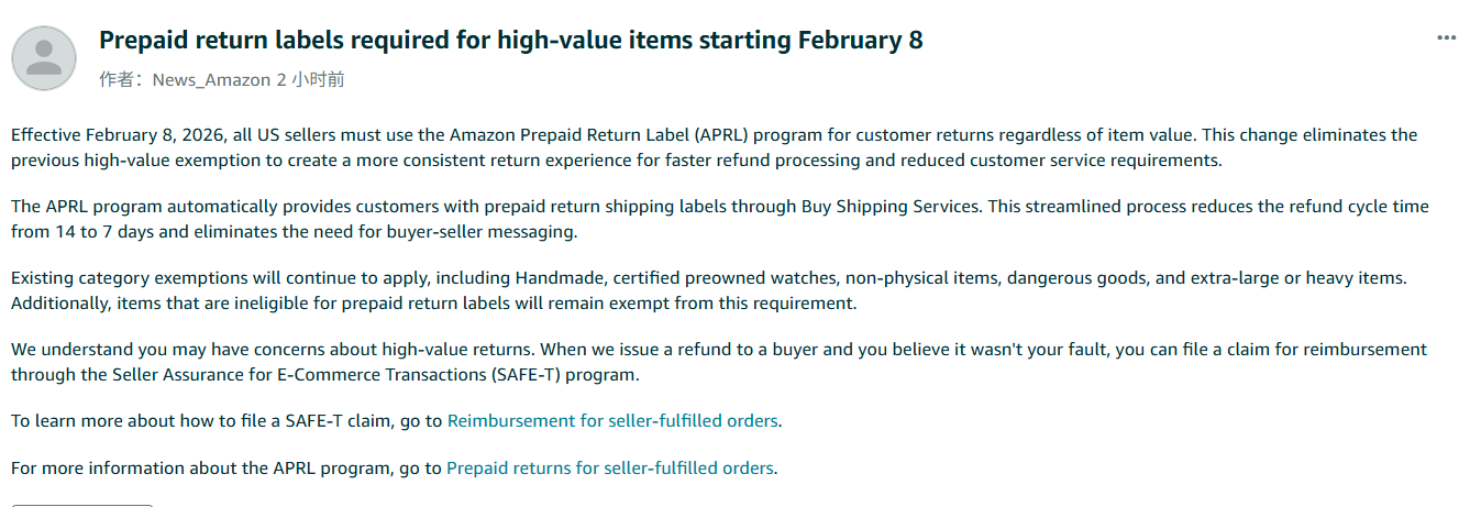 亚马逊宣布,自2026年2月8日起,所有美国卖家必须使用亚马逊预付退货标签(APRL)处理退货不再区分高价值与低价值商品。