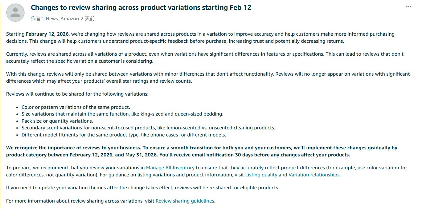 另一项调整涉及产品评价共享方式。自 2026年2月12日起,亚马逊将按照品类逐步实施评论分离机制,仅允许功能上“差异极小”的变体共享评论。而功能差异明显的变体(如不同型号、不同性能的款式)将不再共享评价,以提升评论与评分对买家决策的针对性与准确度。