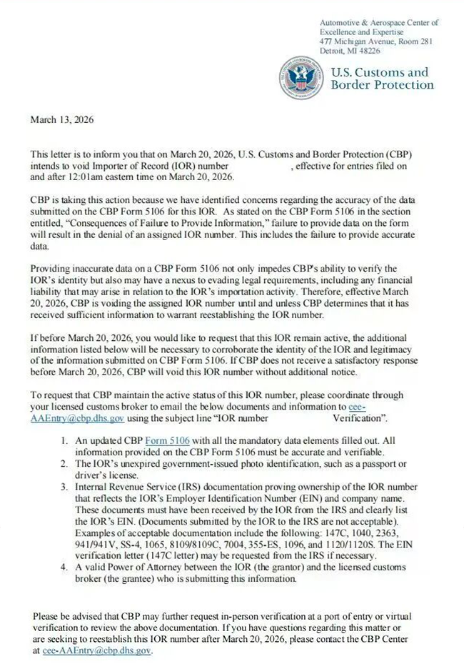 据行业调查了解,进入26年,美国海关监管快速升级,短短两个月内已有超3800个中国货柜触发5H查验,其中80%以上货柜被强制退运,而更关键的变化在于,3月20日起CBP将正式启动的IOR(Importer of Record)集中清理行动。