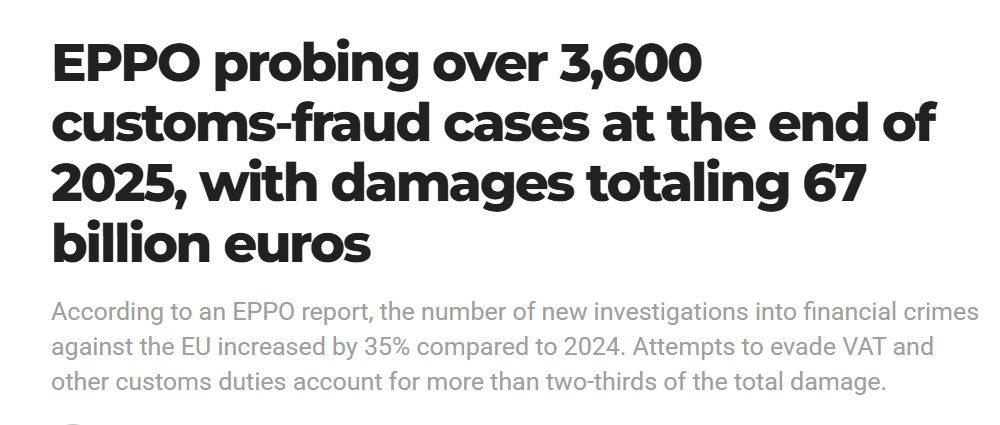 相比美国聚焦进口主体,欧洲方面则把监管重心放在税收与贸易欺诈。根据欧洲公共检察官办公室(EPPO)数据,2025年预计调查3600+起案件,涉案金额达670亿欧元,其中海关欺诈造成约450亿欧元损失,占比超过三分之二。