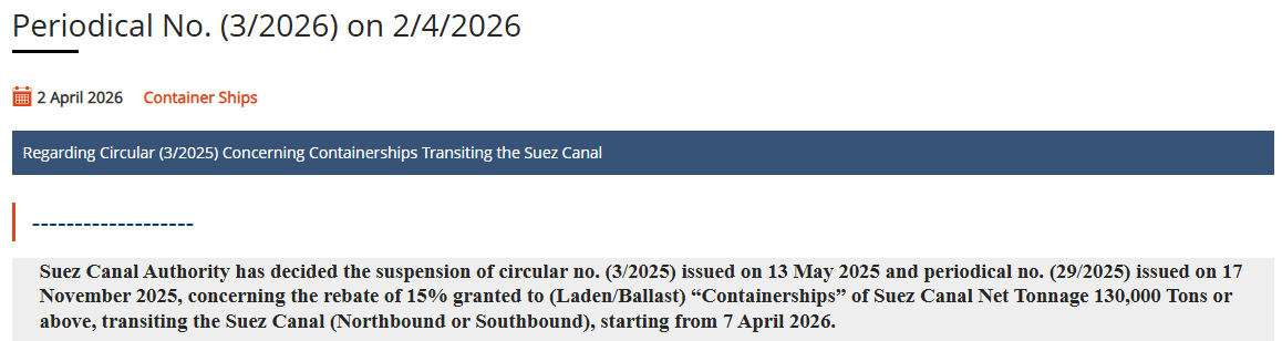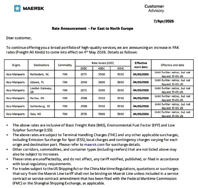 ①马士基上调FAK:马士基宣布自2026年5月4日起,上调远东至北欧航线综合运费(FAK)。②通行费折扣取消:苏伊士运河管理局自4月7日起,取消对大型集装箱船的15%通行费折扣。