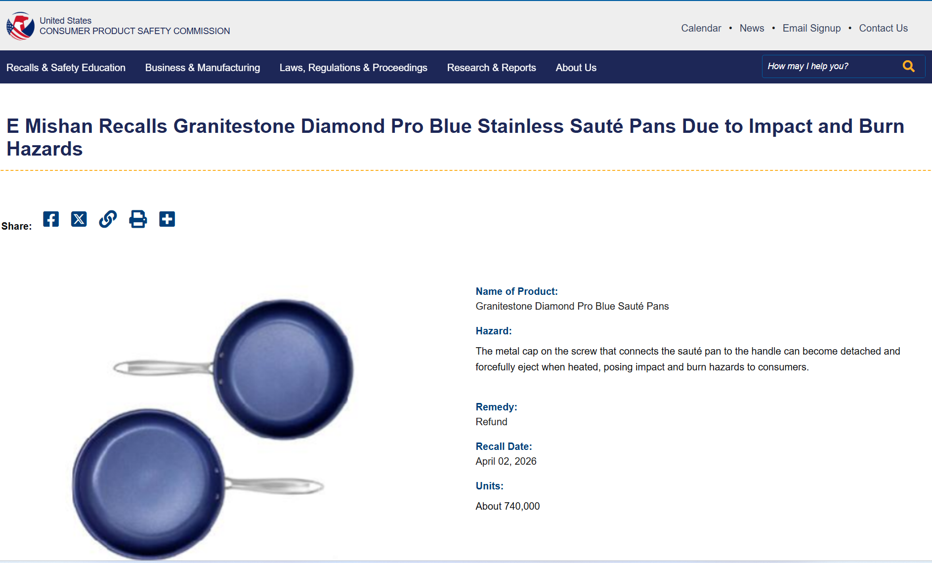 美国消费品安全委员会(CPSC)宣布召回约74万件中国产Granitestone Diamond Pro炒锅。