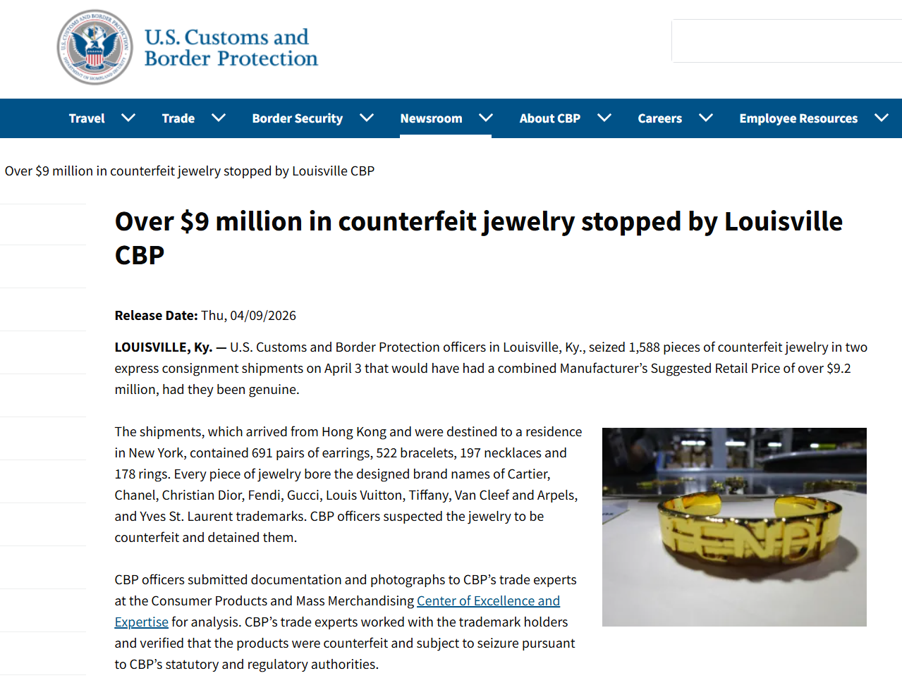 美国海关与边境保护局(CBP)在肯塔基州查获来自香港的1588件假冒珠宝,涉及9大国际品牌,货值(按正品计)超920万美元,当前所有货物已被依法扣押。