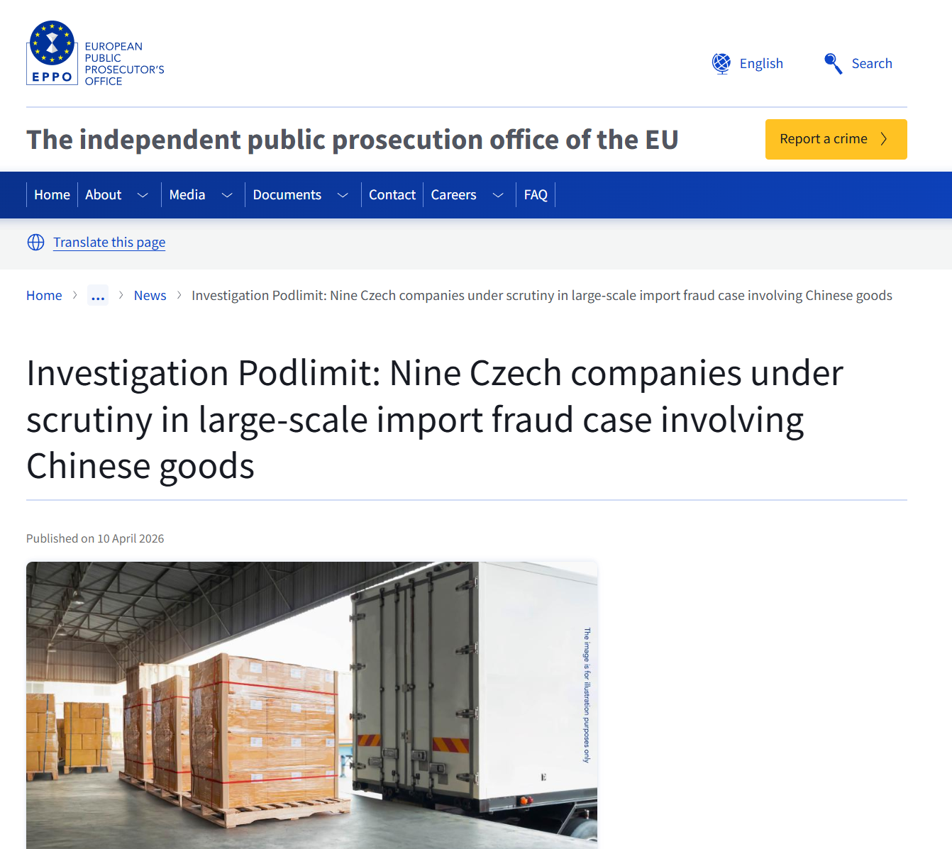 欧盟检察官办公室(EPPO)近日披露重大案件,涉案金额约1.133亿欧元,涉及4000批货物,九家捷克公司。利用海关程序42(CP42)漏洞延迟缴税,同时低报货值、伪造交易链路,将大量货物从中国走私到斯洛伐克和捷克。