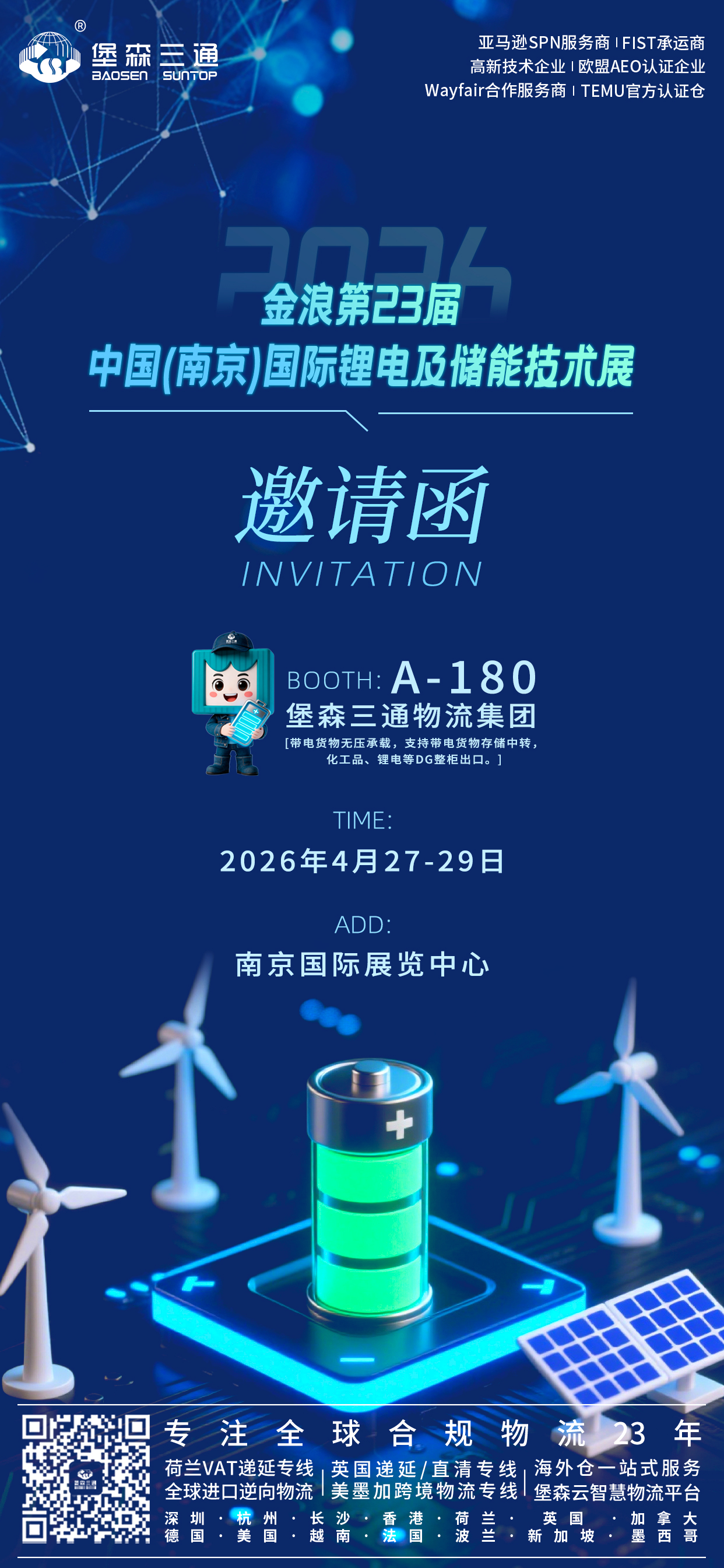 4月27日-29日,2026第23届中国(南京)国际锂电及储能技术展将在南京国际展览中心正式举办。届时,堡森三通将亮相 A-180展位,围绕新能源电池及全球贸易物流需求,为大家提供带电产品运输与全球端到端智慧物流解决方案,在此诚邀广大卖家朋友、平台方与供应链伙伴莅临交流!