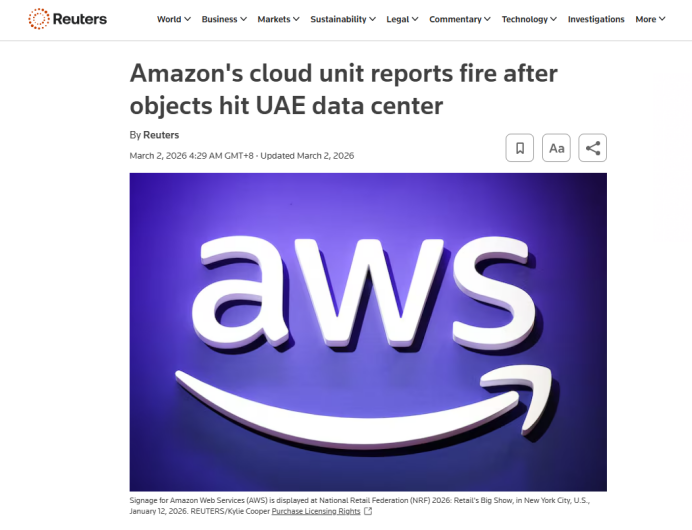 3月初,亚马逊云计算平台(AWS)位于阿联酋的数据中心遭到不明物体击中,引发火灾并导致云服务大面积中断。随后亚马逊证实,其在阿联酋的两处数据中心遭到直接袭击,巴林的一处设施也受到无人机攻击影响。