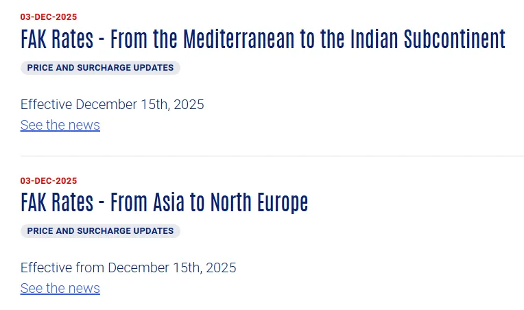 具最新数据看,12月15日之后的欧洲航线新报价整体呈现积极态势。业内普遍预期,下周市场运价仍存在继续上行的空间。目前,多家航运联盟公布的12月下半月FAK参考运价,集中在 2400–2700美元/大箱区间,较当前市场水平上浮 300–500美元。
